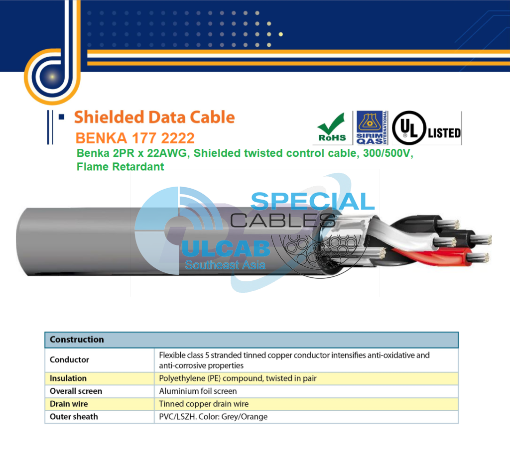 “177 2222” Cáp Tín Hiệu Benka 2Pair 22AWG TCU/PE/OSCR/PVC, Grey, 305m | Chính Hãng – Chống Nhiễu – Chống Bén Cháy