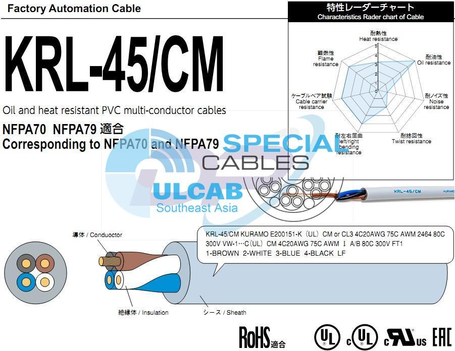 Cáp sensor KRL-45/CM do KURAMO sản xuất đáp ứng nhiều chứng chỉ sensor trên thế giới, với thương hiệu và xuất xứ Japan là một trong những hãng đi đầu về cáp cho nhà máy tại nhật, cáp được làm bằng đồng mềm nguyên chất 100% và được bọc cách điện bằng vỏ PVC chịu nhiệt, vỏ bọc ngoài bằng hợp chất PVC mầu xám, chống dầu, chịu nhiệt, chịu uốn chuyển động.