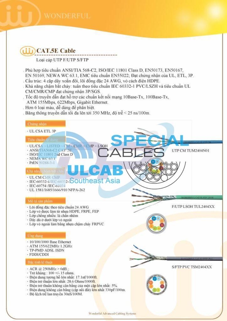 Dây cáp mạng Wonderful Cat.5e UTP 4PAIR 24AWG được sử dụng lõi đồng đặc solid nguyên chất 100%, lõi xoắn từng đôi, cách điện lõi bằng HDPE, FRPE, FEP, dây dù dưới lớp vỏ ngoài giúp xé vỏ bọc dễ dàng, vỏ ngoài được làm bằng nhựa chậm cháy FR-PVC hoặc LSZH chống sinh khói độc khi cháy.