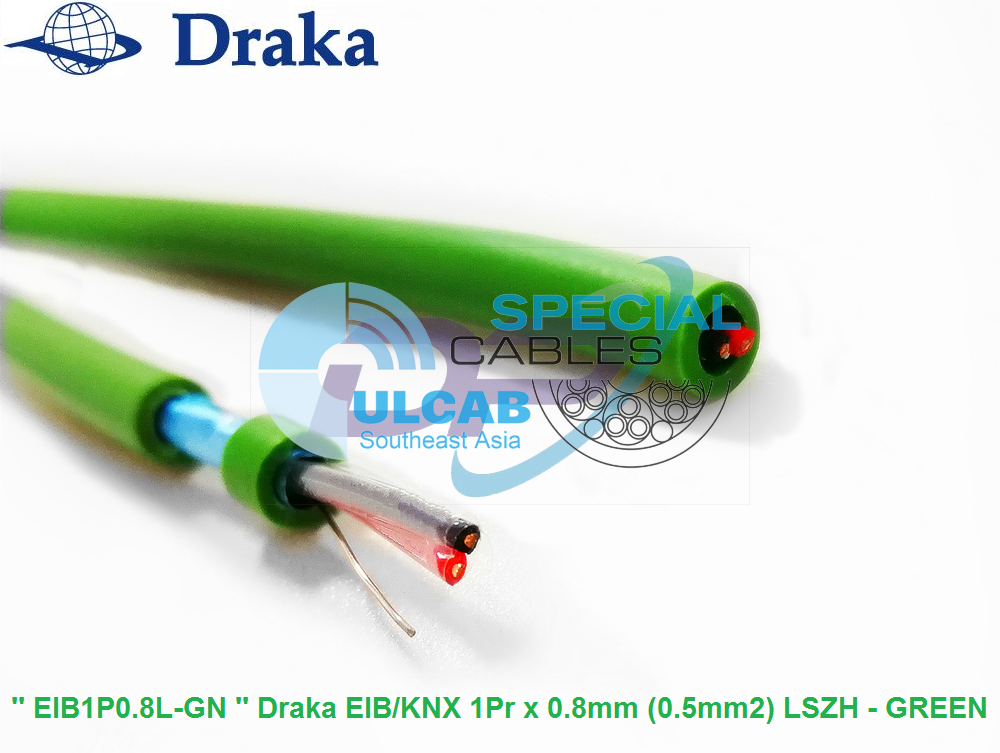 Dây cáp tín hiệu và điều khiển Draka EIB/KNX BUS 75 Ohm được sử dụng Vật liệu dây dẫn: dây đồng trần (solid) 0.80 mm Ø (tương đương 0.5 mm2 ), Cách điện lõi: PE, 1.6 mm Ø, các lõi mầu Đỏ, đen, trắng, vàng, Tấm chắn chống nhiễu tổng thể Lá nhôm nhiều lớp + dây thoát nhiễu bằng đồng 0,71 mm Ø (tương đương 0,4mm2), Vỏ ngoài LSZH mầu xanh lá cây RAL 6018.
