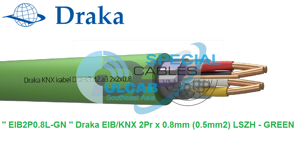 Dây cáp tín hiệu và điều khiển Draka EIB/KNX BUS 75 Ohm được sử dụng Vật liệu dây dẫn: dây đồng trần (solid) 0.80 mm Ø (tương đương 0.5 mm2 ), Cách điện lõi: PE, 1.6 mm Ø, các lõi mầu Đỏ, đen, trắng, vàng, Tấm chắn chống nhiễu tổng thể Lá nhôm nhiều lớp + dây thoát nhiễu bằng đồng 0,71 mm Ø (tương đương 0,4mm2), Vỏ ngoài LSZH mầu xanh lá cây RAL 6018.