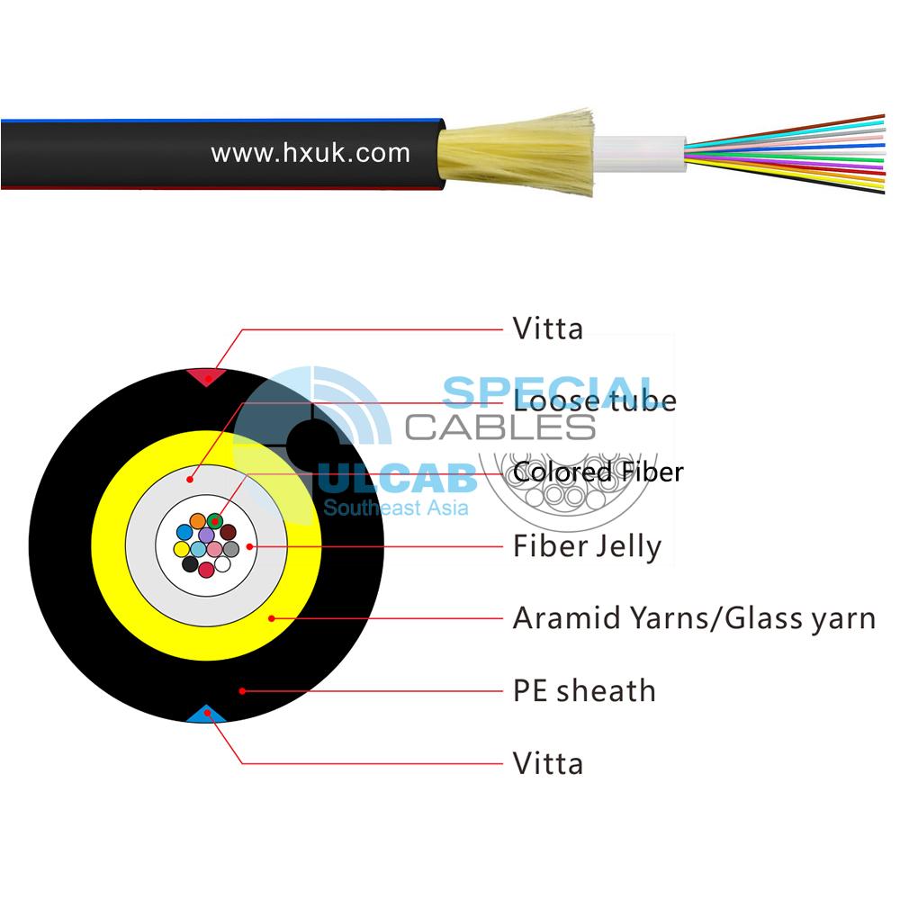 Các sợi, 200/250μm, thuộc loại đơn mode hoặc đa mode, được định vị trong một ống lỏng làm bằng nhựa có mô đun cao. Các ống được đổ đầy hợp chất làm đầy chịu nước. Một lớp sợi aramid hoặc thủy tinh cường độ cao được phủ xung quanh lõi cáp như một thành phần tăng cường độ bền. Sau đó, cáp được hoàn thiện bằng vỏ bọc HDPE màu đen hoặc màu.