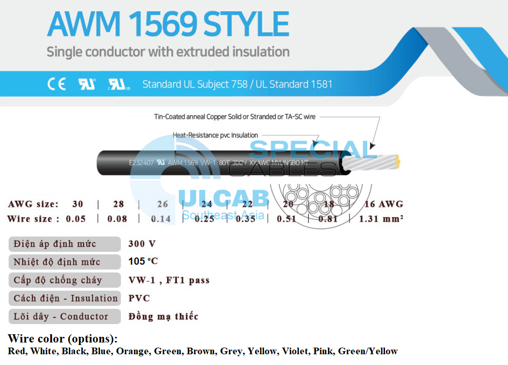 Màu dây AWM 1569 14AWG; 16AWG; 18AWG; 20AWG; 22AWG; 24AWG; 26AWG 28AWG; 30AWG 105°C 300V VW-1 (options): Red, White, Black, Blue, Orange, Green, Brown, Grey, Yellow, Violet, Pink, Green/Yellow