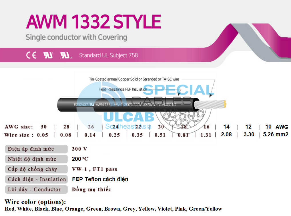 Màu dây AWM 1332 10AWG; 12AWG; 14AWG; 16AWG; 18AWG; 20AWG; 22AWG; 24AWG; 26AWG 28AWG; 30AWG 105°C 300V VW-1 (options): Red, White, Black, Blue, Orange, Green, Brown, Grey, Yellow, Violet, Pink, Green/Yellow