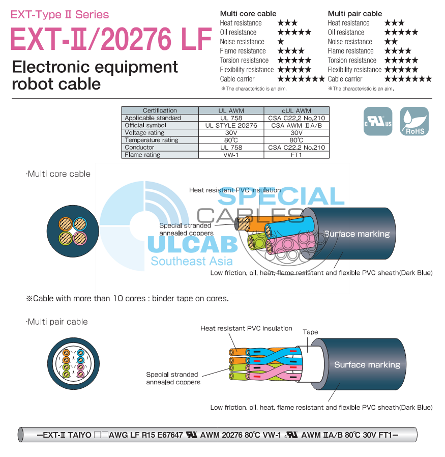 -EXT-II TAIYO 20AWG LF R15 E67647 RU AWM 20276 80°C VW-1 cRU AWM IIA/B 80°C 30V FT1-