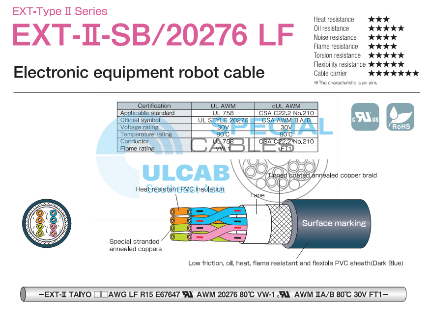 -EXT-II TAIYO 20AWG LF R15 E67647 RU AWM 20276 80°C VW-1 cRU AWM IIA/B 80°C 30V FT1-
