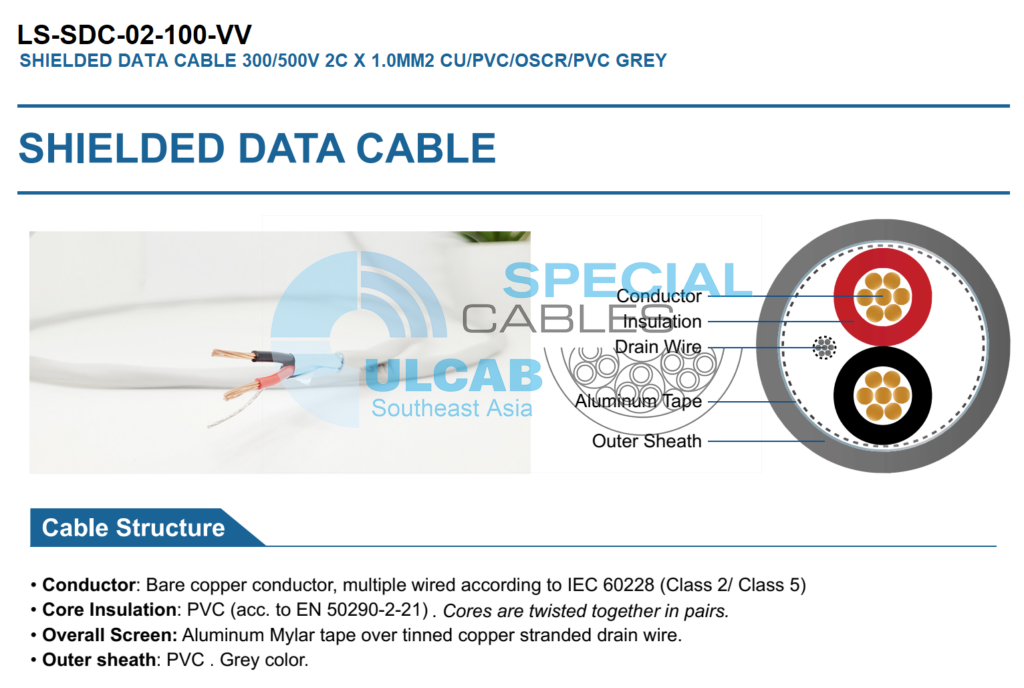 Dây cáp điều khiển tín hiệu LS-SAHAKO LS-SDC-02-100-VV được sử dụng dây dẫn: Dây đồng trần, nhiều dây theo tiêu chuẩn IEC 60228 (Class 2/ Class 5) hoặc ASTM (B 3/ B 33). Tiết diện lõi: 2Cx1.0mm2. Lõi cách điện: PVC (theo EN 50290-2-21) với đánh dấu mầu đen + đỏ. Các lõi được xoắn lại với nhau theo cặp. Chống nhiễu tổng thể: Aluminum Mylar tape + tinned copper stranded drain wire. Vỏ ngoài: PVC. Màu xám.