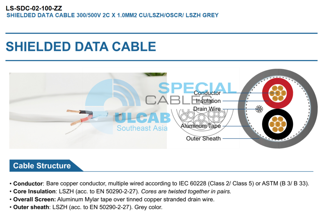 Dây cáp điều khiển tín hiệu LS-SAHAKO LS-SDC-02-100-ZZ được sử dụng dây dẫn: Dây đồng trần, nhiều dây theo tiêu chuẩn IEC 60228 (Class 2/ Class 5) hoặc ASTM (B 3/ B 33). Tiết diện lõi: 2Cx1.0mm2. Lõi cách điện: LSZH (acc. to EN 50290-2-27) với đánh dấu mầu đen + đỏ. Các lõi được xoắn lại với nhau theo cặp. Chống nhiễu tổng thể: Aluminum Mylar tape + tinned copper stranded drain wire. Vỏ ngoài: LSZH (acc. to EN 50290-2-27). Màu xám.