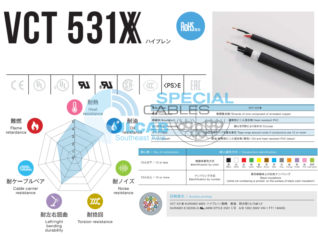 Dây cáp điện và điều khiển tín hiệu KURAMO VCT 531XX được sử dụng dâu dẫn đồng ủ mềm, cách điện lỗi bằng PVC chịu nhiệt, Quấn băng xung quanh lõi nếu số lượng dây dẫn là 12 hoặc nhiều hơn, Vỏ ngoài PVC chống dầu chịu nhiệt, mầu đen.