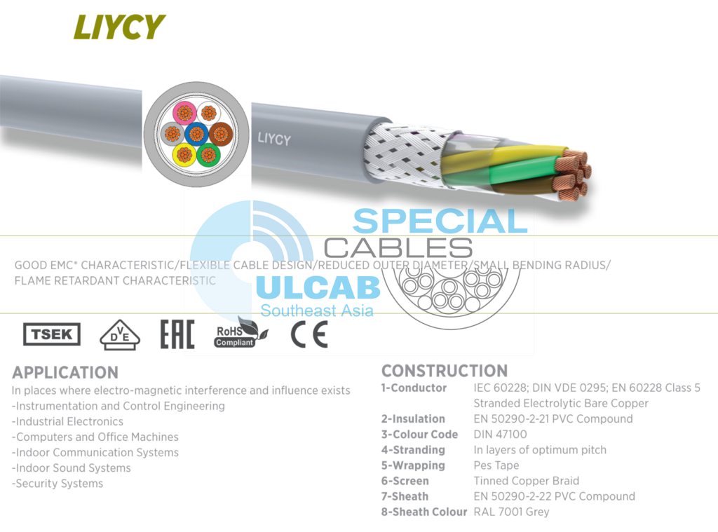 Dây cáp tín hiệu và điều khiển ULCAB ULData® LIYCY được sử dụng dây dẫn IEC 60228; DIN VDE 0295; EN 60228 Lớp 5 Đồng trần điện phân, cách điện Hợp chất PVC, mã mầu DIN 47100, Mắc kẹt trong các lớp. Băng quấn Pes, chống nhiễu lưới đồng bện mạ thiếc, Vỏ bọc Hợp chất PVC chống cháy IEC 60332-1-2, Màu vỏ RAL 7001 Xám.