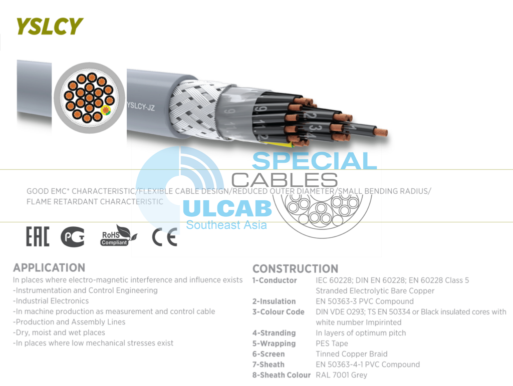 Dây cáp điện và điều khiển tín hiệu ULCAB ULControl® YSLCY-JZ/-JB/-OZ/-OB được sử dụng lõi dẫn IEC 60228; DIN EN 60228; EN 60228 Lớp 5 Đồng trần điện phân, Cách điện từng lõi bằng Hợp chất PVC, Chống Nhiễu EMC: Lưới đồng mạ thiếc, Vỏ ngoài bọc nhựa PVC chống cháy IEC 60332-1-2, Màu vỏ RAL 7001 Xám.