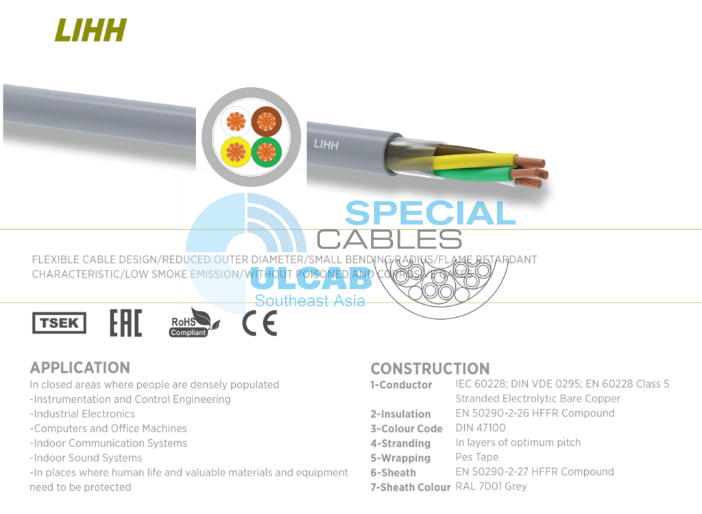 Dây cáp tín hiệu và điều khiển ULCAB ULData® LIHH được sử dụng lõi dẫn IEC 60228; DIN VDE 0295; EN 60228 Lớp 5 Đồng trần điện phân, Cách điện: Hợp chất HFFR, Mã màu DIN 47100, Mắc kẹt trong các lớp, Băng quấn Pes, Vỏ bọc Hợp chất HFFR chống cháy IEC 60332-3-24 và không có Halogen, Màu vỏ RAL 7001 Xám.