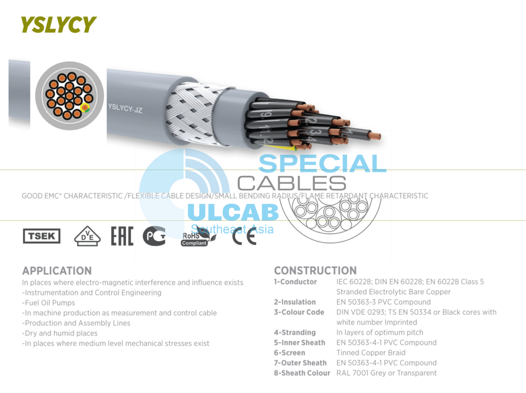 Dây cáp điện và điều khiển tín hiệu ULCAB ULControl® YSLYCY được sử dụng lõi dẫn IEC 60228; DIN EN 60228; EN 60228 Lớp 5 Đồng trần điện phân dạng sợi, Cách điện: Hợp chất PVC, Mã màu DIN VDE 0293; TS EN 50334 hoặc Lõi đen có số màu trắng được in, Vỏ bọc bên trong Hợp chất PVC, Chống nhiễu: Lưới bện đồng mạ thiếc, Vỏ bọc Hợp chất PVC chống cháy IEC 60332-1-2, Màu vỏ RAL 7001 Xám hoặc Trong suốt.