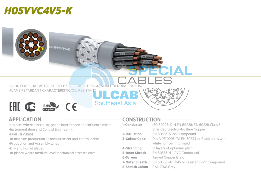 Đồng trần điện phân dạng sợi, Cách điện: Hợp chất PVC, Mã màu DIN VDE 0293; TS EN 50334 hoặc Lõi đen có số màu trắng được in, Vỏ bọc bên trong EN 50363-4-1 Hợp chất PVC, Chống nhiễu: Lưới bện đồng mạ thiếc, Vỏ ngoài EN 50363-4-1 TM5 hợp chất PVC chịu dầu, Màu vỏ RAL 7001 Xám.
