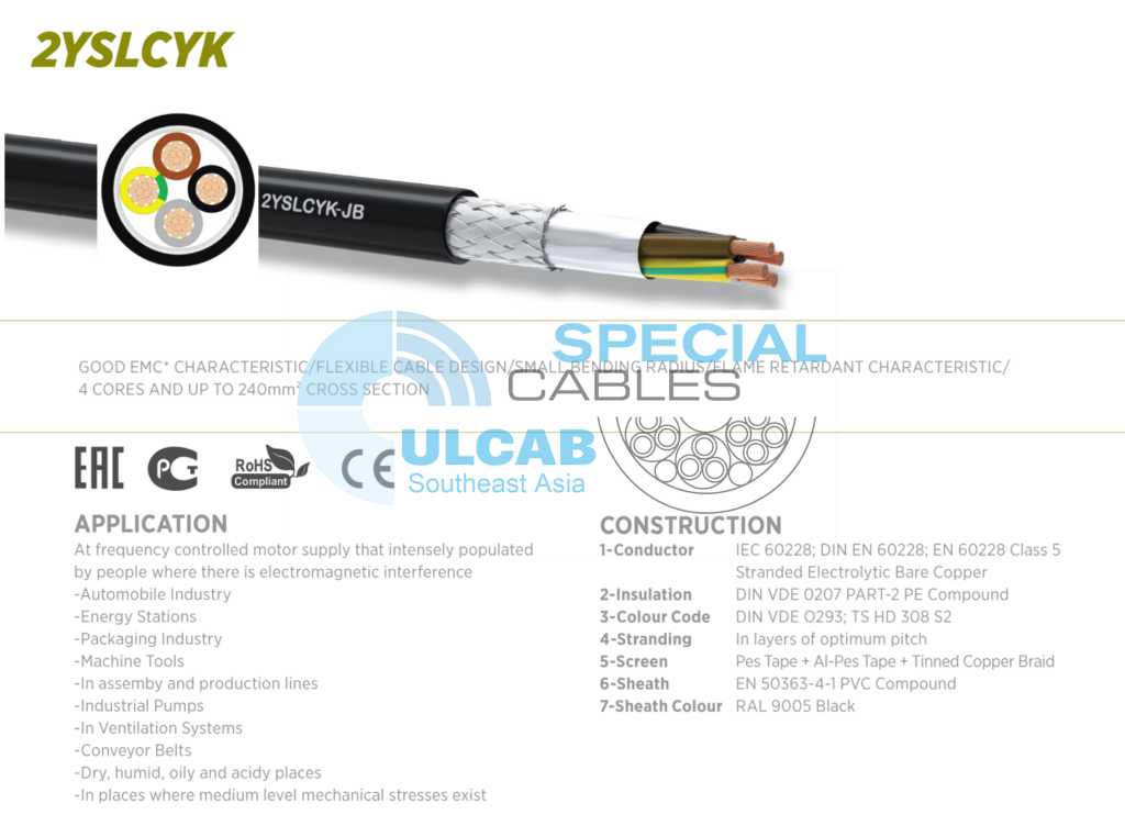 Dây cáp điện và điều khiển tín hiệu ULCAB ULServo® 2YSLCYK đước sử dụng lõi dẫn IEC 60228; DIN EN 60228; EN 60228 Lớp 5 Đồng trần điện phân dạng sợi, cách điện: Hợp chất PE DIN VDE 0207, Mã màu Tiêu chuẩn DIN VDE O293; TS HD 308 S2, chống nhiễu Băng Pes + Băng Al-Pes + lưới bện đồng mạ thiếc, Vỏ bọc EN 50363-4-1 Hợp chất PVC, Màu vỏ RAL 9005 Đen.