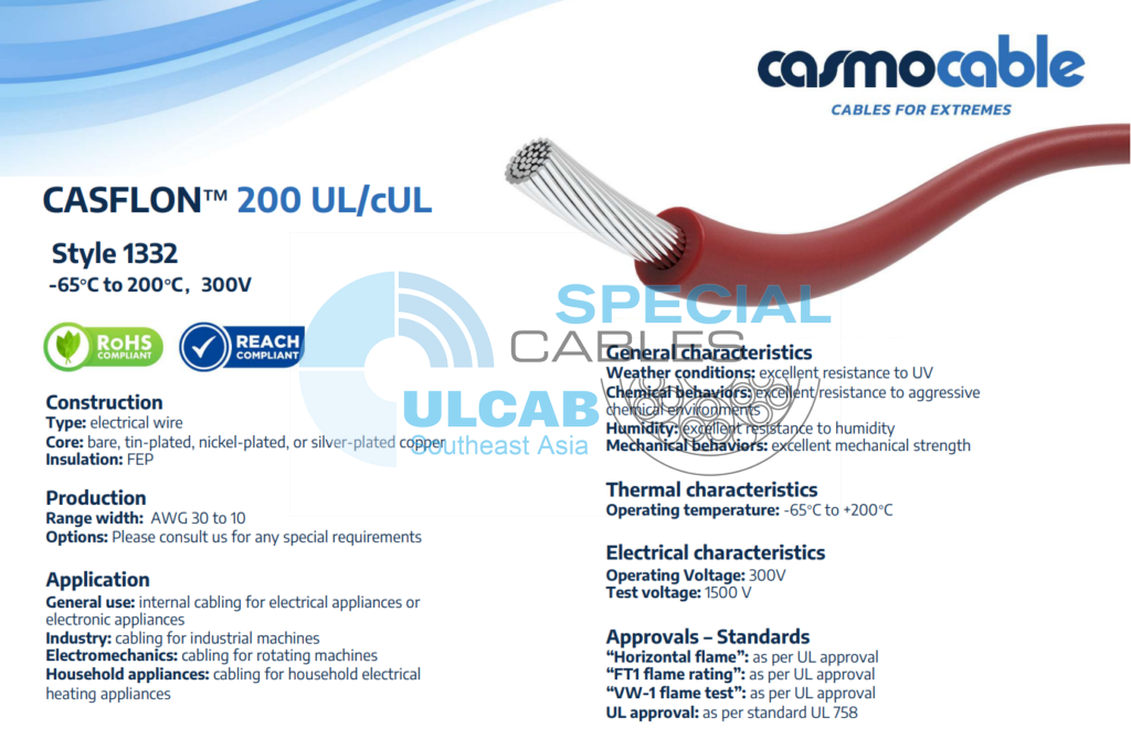 Dây cáp điện và điều khiển tín hiệu chịu nhiệt CASMO CABLE CASFLON™ 200 UL/cUL Style 1332 được sử dụng lõi dẫn đồng trần, mạ thiếc, mạ niken hoặc mạ bạc có khả năng chống ăn mòn vượt trội và không bị oxy hóa ở nhiệt độ cao, cách điện vỏ ngoài FEP có khả năng chống UV, dầu, axit, hóa chất tốt, chống cháy theo chuẩn UL với các mầu vỏ ngoài: Red, White, Black, Blue, Orange, Green, Brown, Grey, Yellow, Violet, Pink, White/Blue, Green/Yellow.