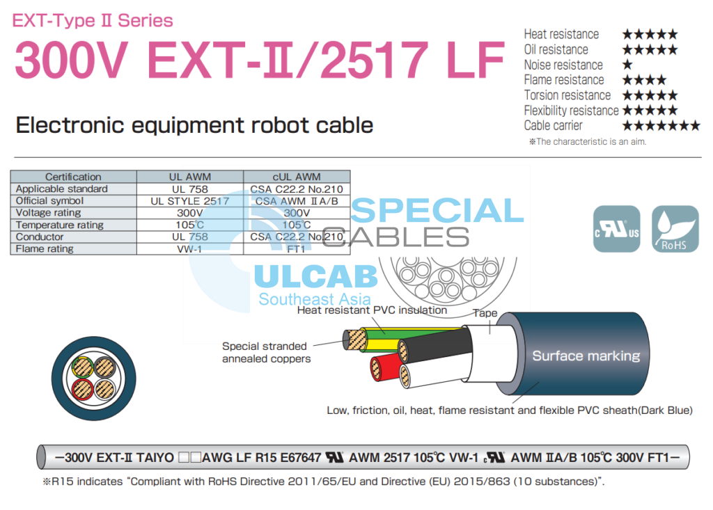 Cáp robot thiết bị điện tử TAIYO 300V EXT-II/2517 LF đước sử dụng dây dẫn Đồng ủ đặc biệt, cách điện PVC chịu nhiệt và ma sát thấp, Tape, Vỏ bọc PVC mềm dẻo, chịu nhiệt, chịu dầu, ma sát thấp (Xanh đậm), chống cháy UL VW-1, cUL FT1.