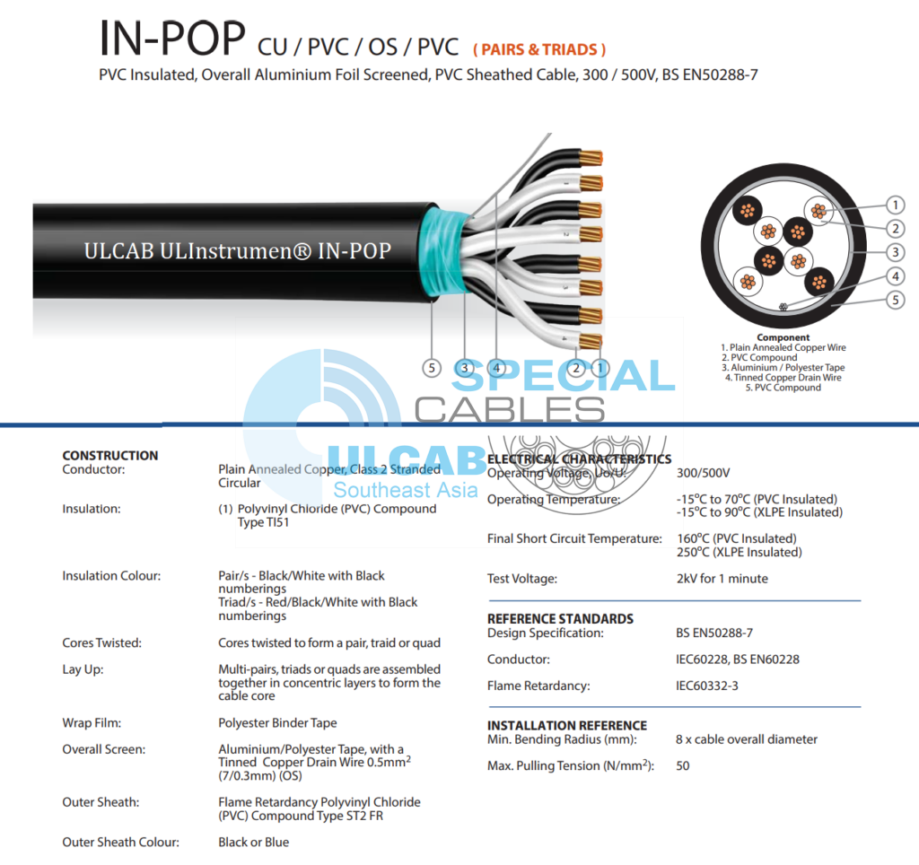 Dây cáp điện và điều khiển tín hiệu ULCAB ULInstrumen® IN-POP CU / PVC / OS / PVC ( PAIRS & TRIADS ) được sử dụng dây Đồng ủ trơn, Class 2, Dây tròn xoắn, cách điện: Hợp chất Polyvinyl Clorua (PVC) Loại TI51, Màu cách điện: Pair – Đen/Trắng với số hiệu màu đen, Triads – Đỏ/Đen/Trắng với số hiệu màu đen, Lõi xoắn: Lõi xoắn lại tạo thành một cặp, một traid hoặc một tứ, Xếp chồng: Nhiều cặp, bộ ba hoặc bộ bốn được lắp ráp lại với nhau theo các lớp đồng tâm để tạo thành lõi cáp, Màng bọc: Băng Polyester, Chống nhiễu tổng thể: Băng nhôm/polyester, có dây thoát nhiễu bằng đồng mạ thiếc 0,5mm2 (7/0,3mm) (OS), Vỏ bọc bên ngoài: Hợp chất Polyvinyl Clorua (PVC) chống cháy Loại ST2 FR, Màu vỏ ngoài: Đen hoặc Xanh Dương.