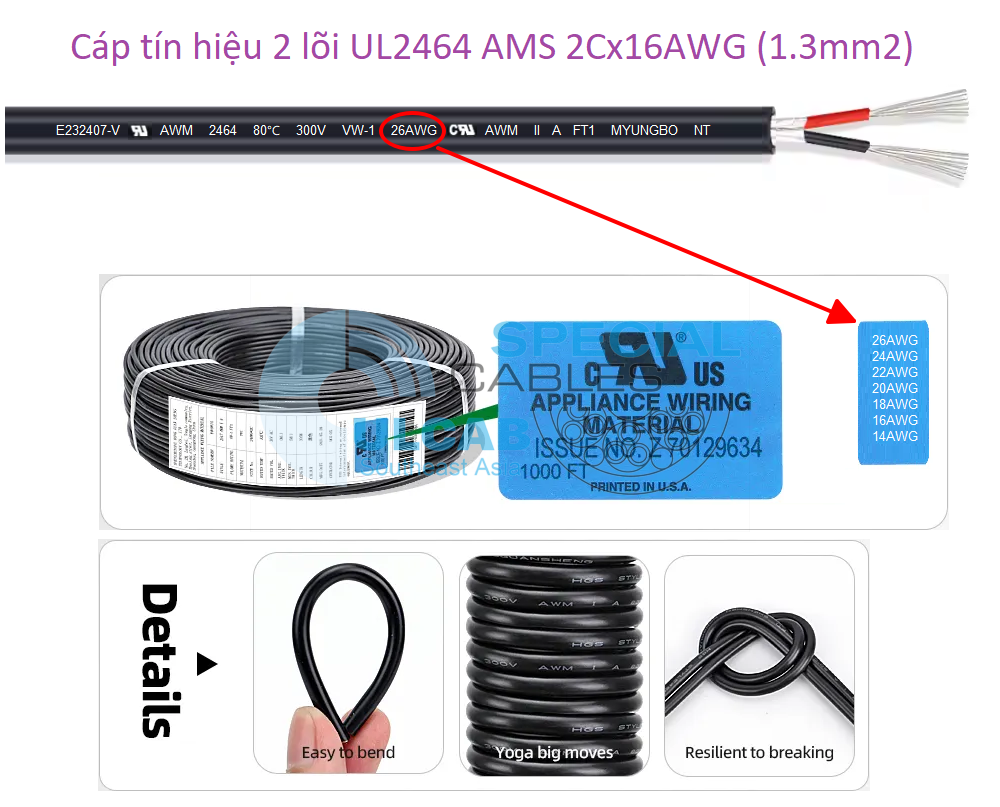 Cáp tín hiệu 2 lõi UL2464 2Cx16AWG (1.3mm2) 300V PVC VW-1 FT1 BLACK | Chính Hãng – Giá Tốt Nhất