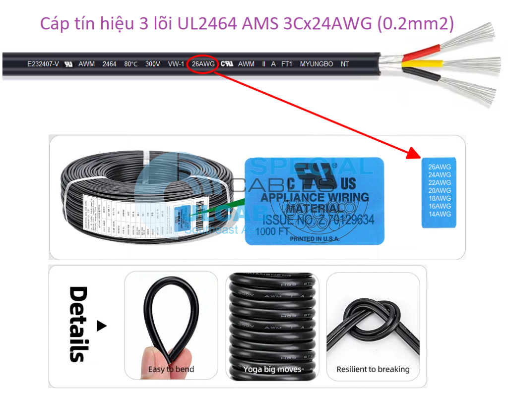 - Chủng loại: Dây điện tử 3 Core / Lõi / Sợi – 24AWG.