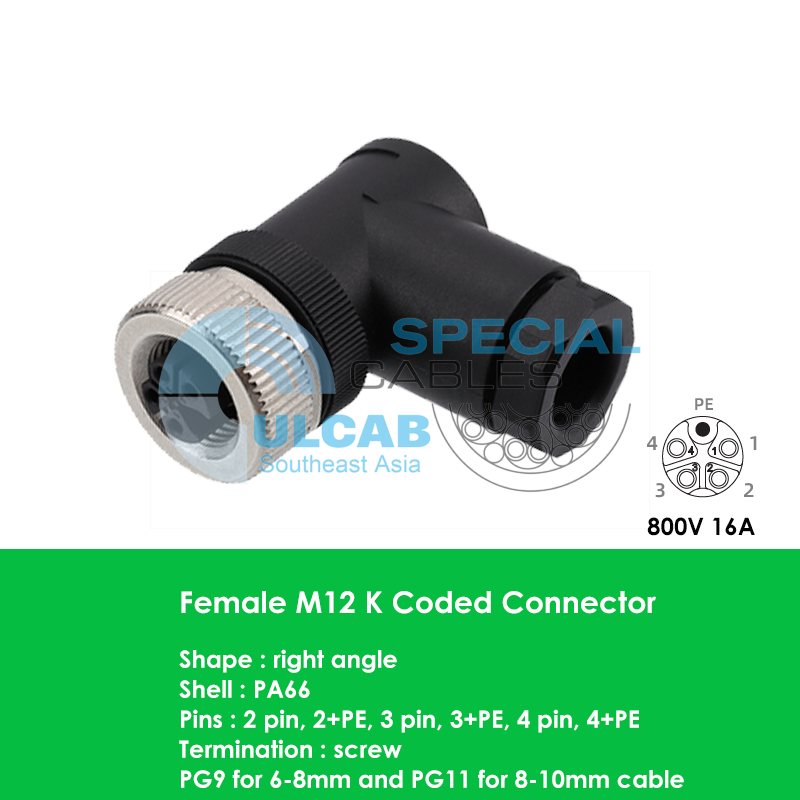Đầu nối M12 mã K Female là đầu nối nguồn cung cấp điện áp định mức AC 800V và dòng điện định mức 16A.