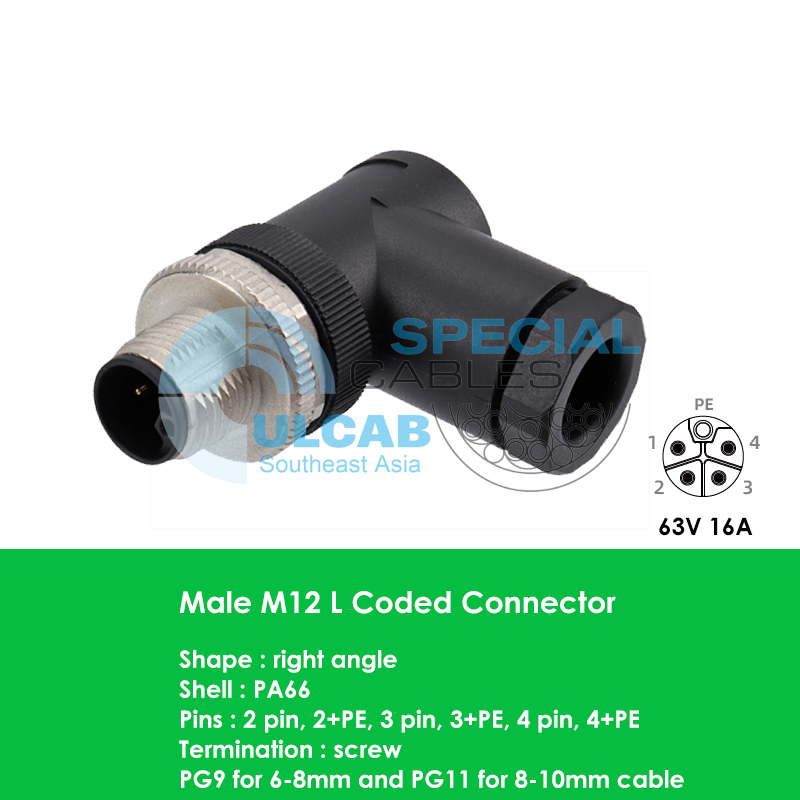 Đầu nối dây điện góc phải mã L M12 Male là đầu nối nguồn được làm bằng vỏ PA66, có điện áp định mức DC 63V và dòng điện định mức 16A.