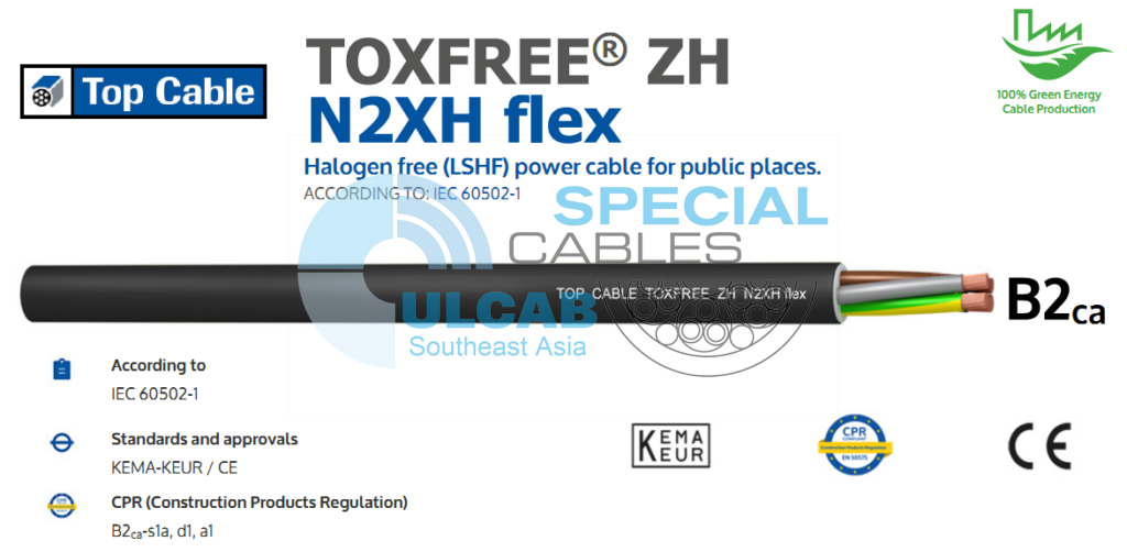 Dây cáp điện TOP CABLE TOXFREE ZH N2XH flex được sử dụng Ruột dẫn bằng đồng ủ điện phân, loại 5 (mềm dẻo), dựa trên EN 60228 và IEC 60228. Lớp cách điện polyethylene liên kết ngang (XLPE) theo tiêu chuẩn IEC 60502-1. Tiêu chuẩn nhận dạng của dây dẫn cách điện theo HD 308 như sau: 1 x Tự nhiên, 2 x Xanh + Nâu, 3G Xanh dương + Nâu + Xanh lá/Vàng, 3 x Nâu + Đen + Xám, 3 x + 1 x Nâu + Đen + Xám + Xanh lam (mặt cắt giảm), 4 G Nâu + Đen + Xám + Xanh lá/Vàng, 4 x Nâu + Đen + Xám + Xanh, 5 G Nâu + Đen + Xám + Xanh dương + Xanh lá/Vàng. Vỏ ngoài Polyolefin không khói halogen (LSHF). Màu đen.