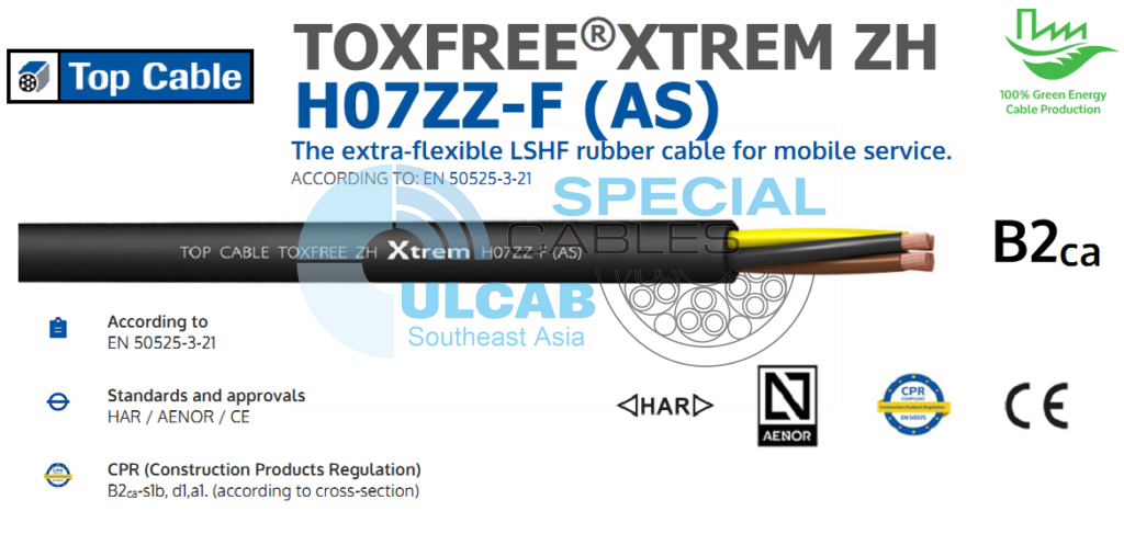 Dây cáp điện TOP CABLE TOXFREE ZH XTREM H07ZZ-F (AS) được sử dụng dây dẫn Đồng ủ điện phân, loại 5 (linh hoạt), dựa trên EN 60228 và IEC 60228. Cách nhiệt Cao su LSHF loại EI8 theo tiêu chuẩn EN 50363-5. Tiêu chuẩn nhận dạng của dây dẫn cách điện như sau: 1 x Tự nhiên, 2 x Xanh + Nâu, 3G Xanh dương + Nâu + Vàng/Xanh lá, 4 G Nâu + Đen + Xám + Vàng/Xanh lá, 5 G Nâu + Đen + Xám + Xanh + Vàng/Xanh lá, 6 hoặc nhiều hơn Đen đánh số + Vàng/Xanh lá. Vỏ ngoài Cao su không khói halogen (LSHF) loại EM8 theo tiêu chuẩn EN 50363-6. Màu đen.