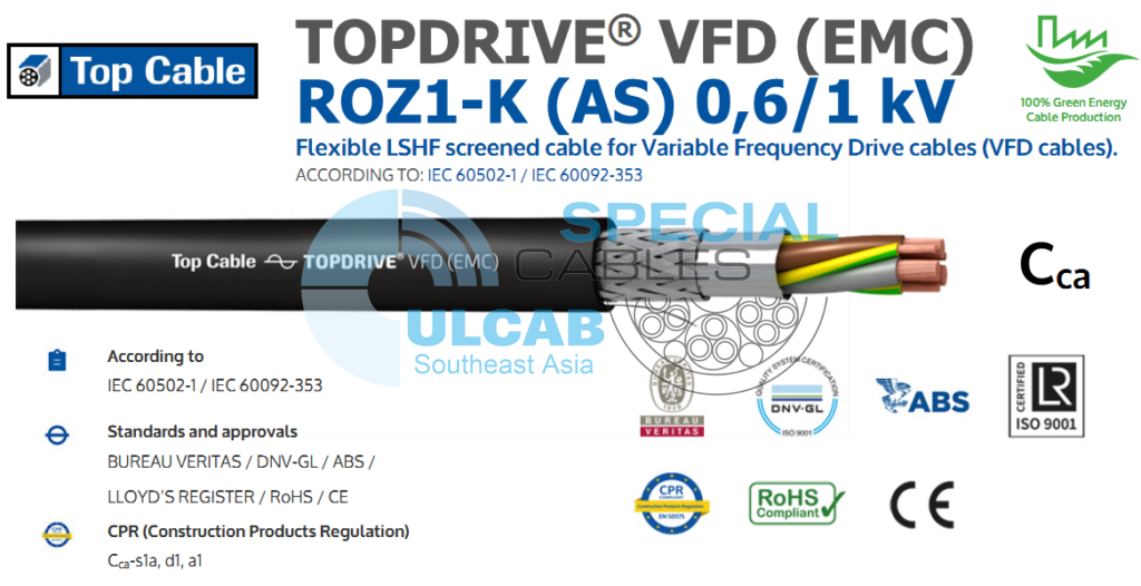 TOPDRIVE VFD (EMC) ROZ1-K (AS) 0,6/1kV cable has been specially designed for Variable Frequency Drive Motors and installations where it is necessary to limit the effects of electromagnetic interference (EMI). This is a flexible cable for fixed installations, for variable speed motors or pumps.