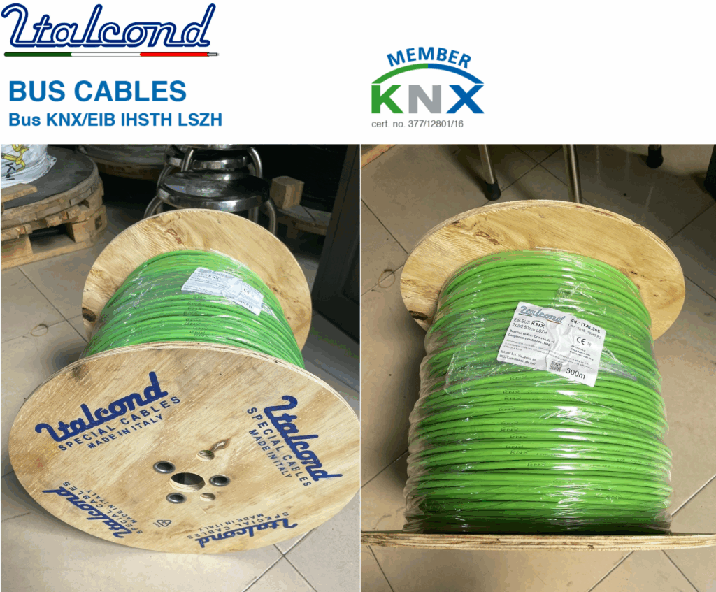 Dây cáp tín hiệu và điều khiển ITALCOND (ITAL356) EIB/KNX BUS được sử dụng Vật liệu dây dẫn: dây đồng trần (solid) Ø 0,8 mm, Cách điện lõi: LSOH, flame retardant, các lõi được đánh đấu bằng màu Đỏ, Đen, Trắng, Vàng, Lõi xoắn thành quad, Chống nhiễu Aluminium/Polyester 100% coverage, với dây thoát nhiễu đồng mạ thiếc, Vỏ bọc bên ngoài: LSOH, flame retardant, Green (RAL 6018).