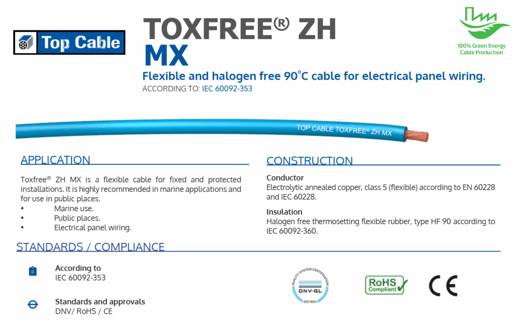 Dây cáp điện lõi đơn TOP CABLE 0.6/1KV TOXFREE ZH MX 90ºC Halogen Free | Chính Hãng – MARINE CABLES – Offshore – Giá Tốt Nhất