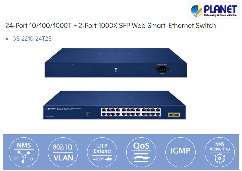 PLANET GS-2210-24T2S Smart Ethernet switch combined with NMS makes network management easier and more efficient. In addition, it is easy to configure whatever application that the industry needs. It features link aggregation, IGMP, QoS, CLI and more to improve the availability of critical business applications.
