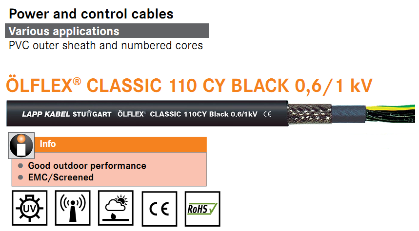 Dây cáp điện và điều khiển tín hiệu LAPP KABEL ÖLFLEX® CLASSIC 110 CY BLACK 0,6/1 kV được sử dụng Sợi dây mảnh làm từ dây đồng trần Class 5; Cách điện PVC LAPP P8/1; Vỏ bọc PVC bên trong, màu đen; Chống nhiễu: Bện lưới đồng mạ thiếc; Vỏ bọc PVC bên ngoài, màu đen (RAL 9005). Chống cháy theo tiêu chuẩn IEC 60332-1-2; Chống tia UV và thời tiết theo tiêu chuẩn ISO 4892-2; Chống ozone theo tiêu chuẩn EN 50396.