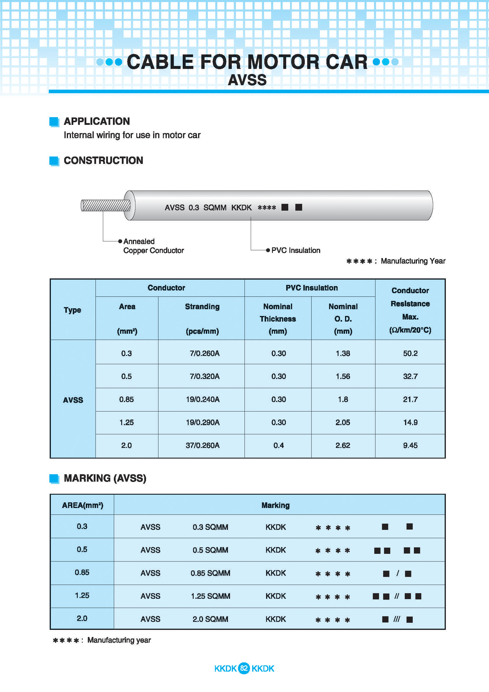 Dây cáp điện cho ôtô KDK KAWASAKI AVSS được sử dụng lõi dẫn đồng ủ, Với các Size: 0.3mm2 – 0.5mm2 – 0.85mm2 – 1.25mm2 – 2.0mm2; Cách nhiệt: PVC