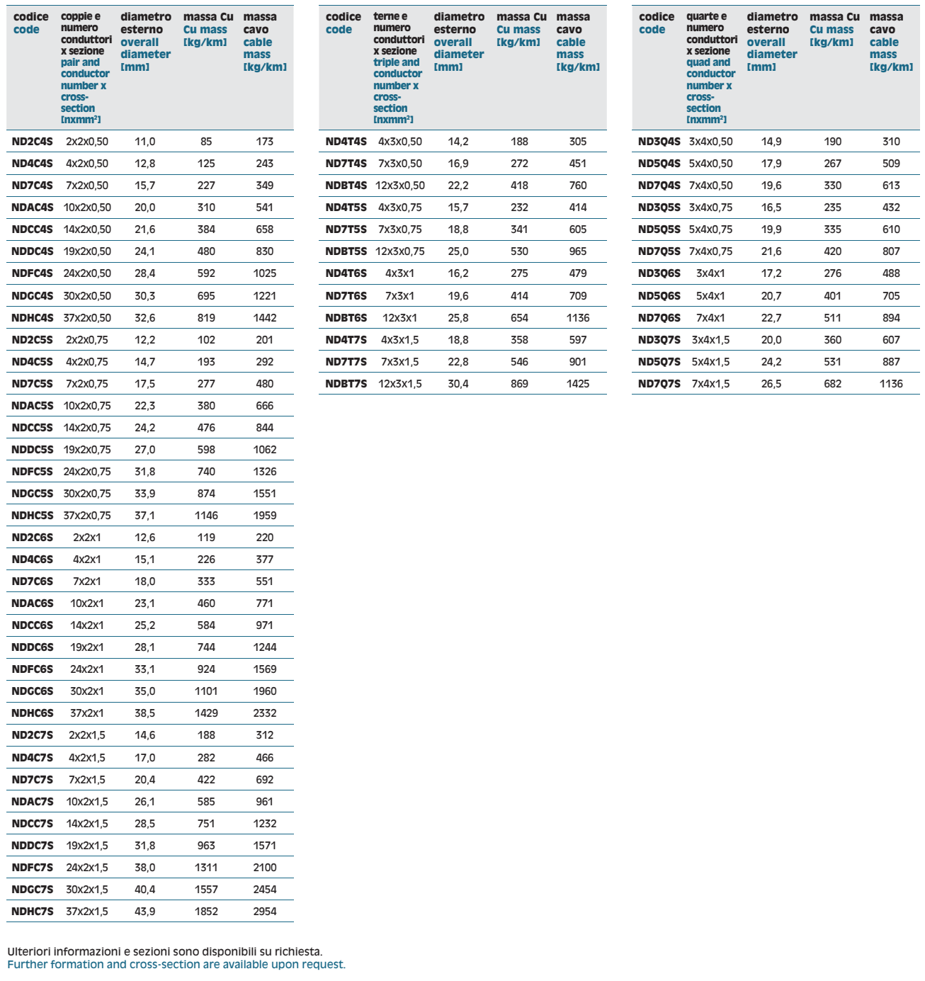 Cable diameter > 20mm: UNIKA (Italy) – SH-CI-I-A-F S95 150/250 V 90°C (n° cores) x (n° units) x (cross-section) – IEC 60092-376 – IEC 60332-3-22 – IEC 60331-21 – IEC 60331-1 – traceability code