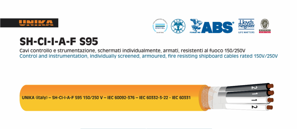 Dây cáp điều khiển tín hiệu chống cháy ngoài khơi UNIKA SH-CI-I-A-F S95 là loại cáp (control & instrumentation) dùng cho môi trường tàu biển và công trình ngoài khơi (offshore) được sử dụng Ruột dẫn: Đồng Trần (đồng mạ thiếc tùy chọn) Class 5 theo IEC 60228; Cách điện: Hợp chất silicon S95 theo tiêu chuẩn IEC 60092-360 Độ dày theo tiêu chuẩn IEC 60092-376; Nhận dạng cốt lõi (ưu tiên): Cặp: đen, trắng với các số 1-1, 2-2, 3-3, … Bộ ba: đen, trắng, đỏ với các số 1-1-1, 2-2-2, 3-3-3, … Bộ tứ: đen, trắng, đỏ, xanh với các số 1-1-1-1, 2-2-2-2, 3-3-3-3, …; Lắp ráp lõi đơn: Mỗi lõi được lắp ráp tạo thành cặp hoặc bộ ba hoặc bộ bốn (đơn vị); Màn hình riêng trên mỗi đơn vị: Băng nhôm/polyester có dây thoát nước (tùy chọn dây bện bằng đồng trần hoặc đồng thiếc); Lắp ráp đơn vị: Tất cả các lõi hoặc đơn vị được lắp ráp theo hình tròn với chất độn phù hợp và băng không hút ẩm; Băng dính: Băng dính không hút ẩm; Giáp: Đồng trần (theo yêu cầu đồng thiếc hoặc dây thép mạ kẽm bện Độ phủ tối thiểu 90%; Vỏ ngoài: Hợp chất SHF1 theo IEC 60092-360 Độ dày theo IEC 60092-376 Màu sắc: cam (hoặc màu khác theo thỏa thuận) Đường kính ngoài theo IEC 60092-350 phụ lục D.