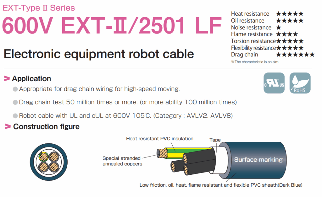 Dây cáp điện và điều khiển tín hiệu chịu gập, chịu uốn, chịu xoắn, chuyển động ROBOT / Băng Tải / Drag chain TAIYO/ JAPAN EXT-II/2501 LF 600V Sử dụng dây dẫn đặc biệt siêu mịn. PVC chịu nhiệt và ma sát thấp được sử dụng làm vật liệu cách điện. PVC chịu dầu và chịu nhiệt được sử dụng làm vỏ bọc. Vật liệu ma sát thấp được sử dụng làm vỏ bọc. Chống cháy: UL VW-1, cUL FT1.