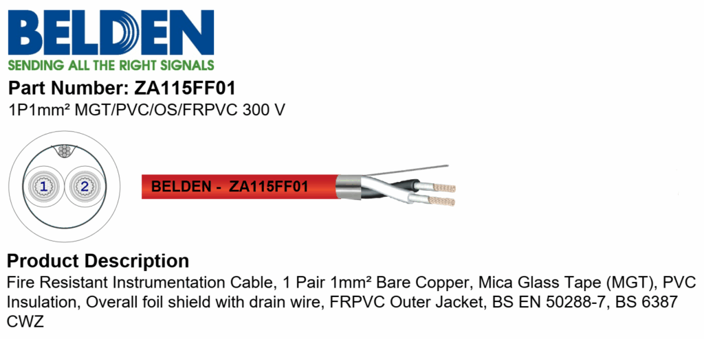 BELDEN ZA115FF01 là một loại cáp tín hiệu chịu lửa, có cấu trúc rõ ràng theo chuẩn kỹ thuật quốc tế (rất giống cấu trúc của các cáp báo cháy tiêu chuẩn BS 6387 hoặc IEC 60331).