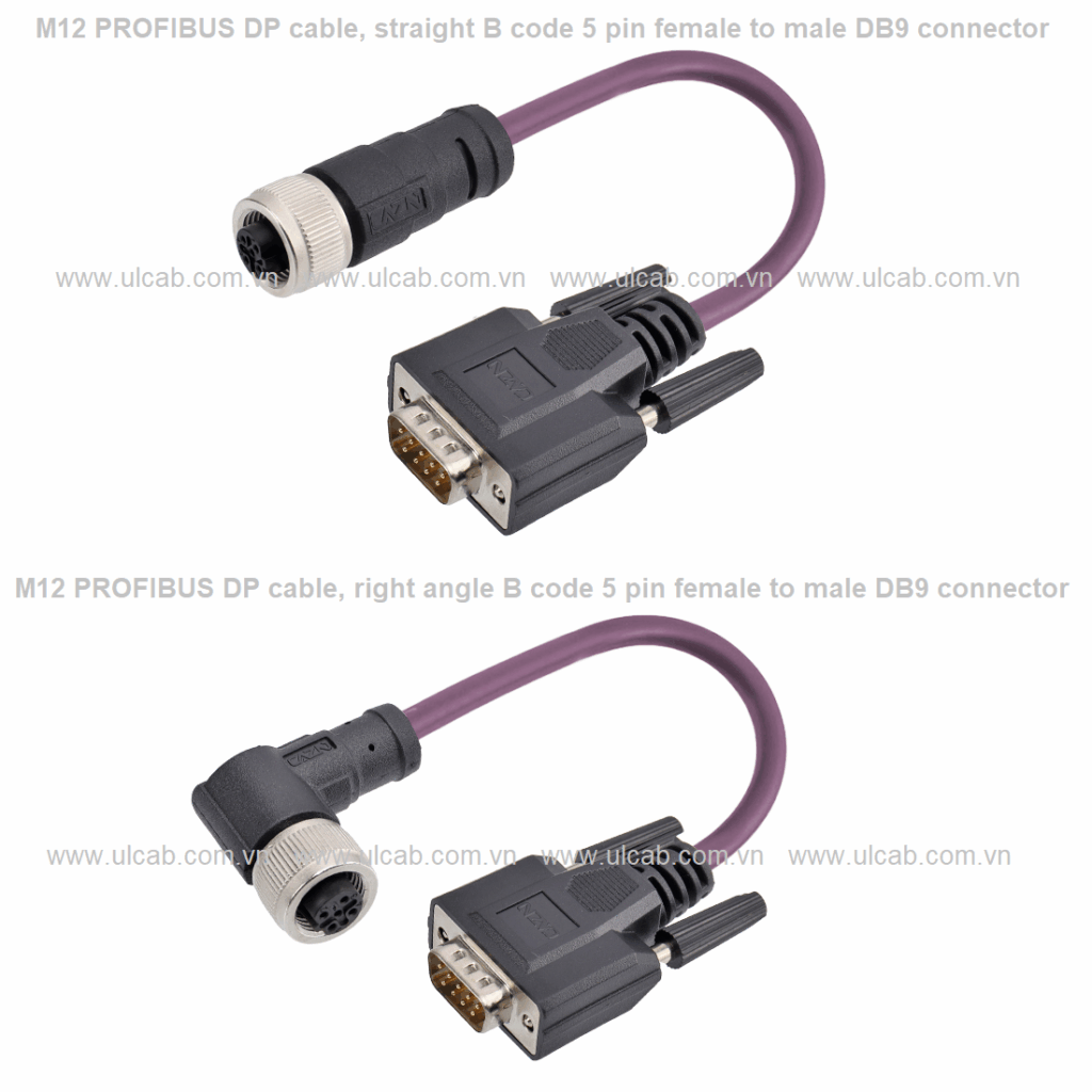 - ULCAB-CM14-M12-A4-S5B/DB9M-xM: Cáp PROFIBUS DP M12, đầu nối DB9 5 chân cái sang đực, thẳng, B-Code, vỏ bọc PVC, màu tím
