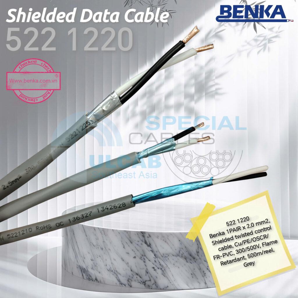 Dây cáp điện và điều khiển tín hiệu vặn xoắn chống nhiễu BENKA 522 1220 được sử dụng dây dẫn bằng Đồng trần mềm, bện nhiều sợi, cấp mềm CLASS 5, Size: 1Pair x 2.0mm2, Cách điện (Insulation): Polyethylene (PE), 2 lõi xoắn thành 1 cặp (1 Pair) với hai màu đen + trắng, Lớp chống nhiễu / màn chắn (Overall screen): Băng nhôm (Aluminium foil) bao phủ 100%, Vỏ ngoài (Outer sheath): FR-PVC Màu Xám. chắc chắn, có thể chống chịu tốt các tác nhân từ ngoài môi trường, thích hợp với mọi môi trường trong nhà, cáp cho dự án công trình nhà máy và tòa nhà.