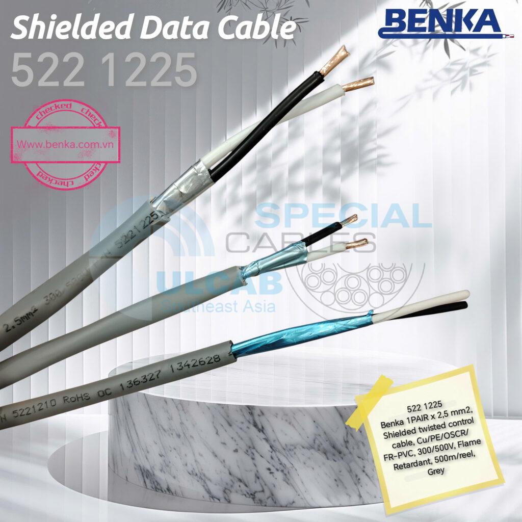 Dây cáp điện và điều khiển tín hiệu vặn xoắn chống nhiễu BENKA 522 1225 được sử dụng dây dẫn bằng Đồng trần mềm, bện nhiều sợi, cấp mềm CLASS 5, Size: 1Pair x 2.5mm2, Cách điện (Insulation): Polyethylene (PE), 2 lõi xoắn thành 1 cặp (1 Pair) với hai màu đen + trắng, Lớp chống nhiễu / màn chắn (Overall screen): Băng nhôm (Aluminium foil) bao phủ 100%, Vỏ ngoài (Outer sheath): FR-PVC Màu Xám. chắc chắn, có thể chống chịu tốt các tác nhân từ ngoài môi trường, thích hợp với mọi môi trường trong nhà, cáp cho dự án công trình nhà máy và tòa nhà.