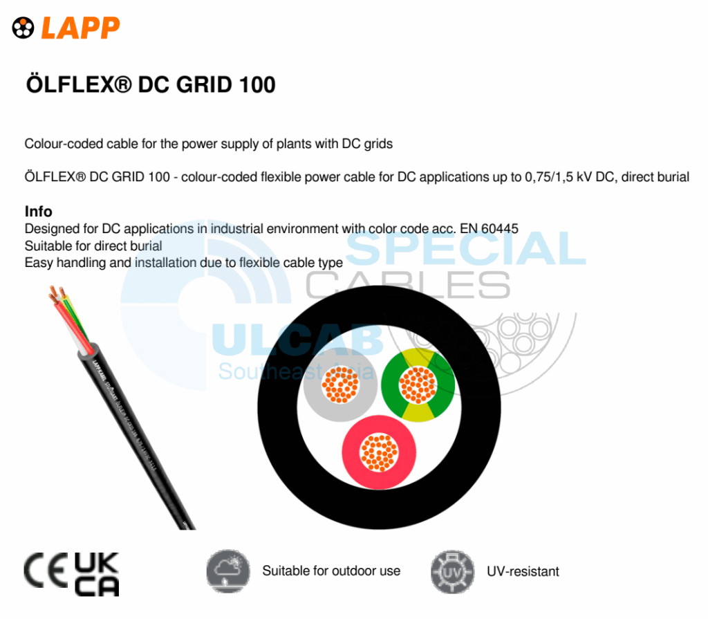 Dây cáp điện và điều khiển tín hiệu LAPP KABEL ÖLFLEX® DC GRID 100 được sử dụng Dây dẫn mảnh làm từ các sợi đồng trần; Lớp cách điện lõi: PVC; đặc biệt Màu lõi: 3 dây dẫn: đỏ, trắng, xanh vàng Màu lõi: 4 dây dẫn: đỏ, trắng, xanh dương, xanh vàng; Vỏ ngoài bằng PVC, màu đen (tương tự RAL 9005). Chống cháy theo tiêu chuẩn IEC 60332-1-2, Chống tia cực tím và thời tiết theo tiêu chuẩn ISO 4892-2, Chống ozone theo tiêu chuẩn EN 50396.