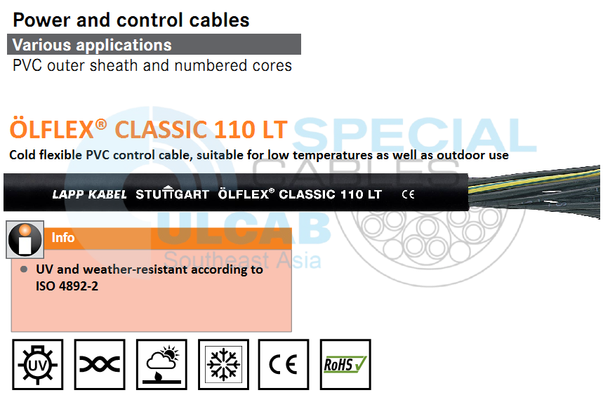Dây cáp điện và điều khiển tín hiệu LAPP KABEL ÖLFLEX® CLASSIC 110 LT được sử dụng Dây dẫn mảnh làm từ các sợi đồng trần; Lớp cách điện lõi: PVC, chịu lạnh; Các lõi được xoắn thành nhiều lớp; Vỏ ngoài: PVC, chịu lạnh, màu đen. Chống cháy theo tiêu chuẩn IEC 60332-1-2 Dẻo dai đến -30°C, Chống tia cực tím và thời tiết theo tiêu chuẩn ISO 4892-2, Chống ozone theo tiêu chuẩn EN 50396.