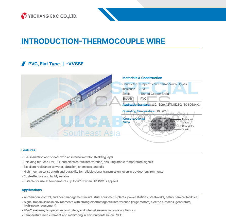 Dây cáp bù nhiệt loại PVC, Flat Type (-VVSBF) được thiết kế với lớp cách điện và vỏ PVC kèm lớp chắn EMI bằng kim loại, đảm bảo tín hiệu nhiệt độ ổn định trong môi trường công nghiệp. Sản phẩm kết hợp giữa độ bền cao, khả năng chống nước, hóa chất, dầu mỡ và cơ khí, phù hợp cho các hệ thống đo lường và điều khiển nhiệt độ.