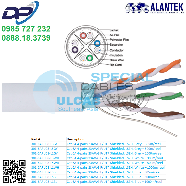 | 301-6AFU08-L3GY | Cat 6A 4-pairs 23AWG F/UTP Shielded, LSZH, Grey – 305m/reel |
