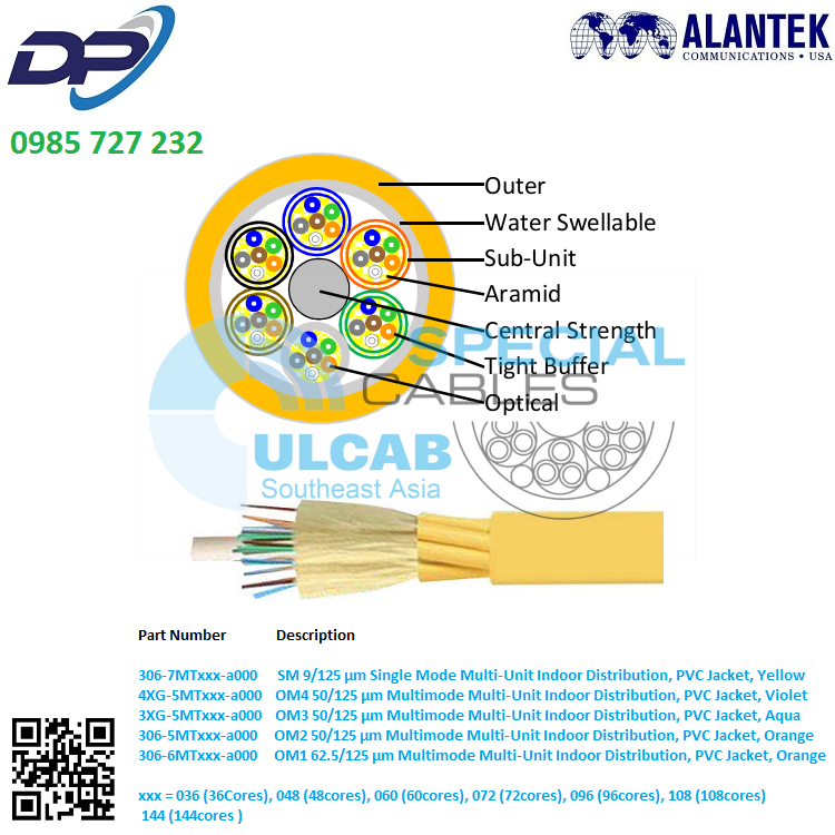 | 306-5MT108-Y000 | Alantek 108 Cores OM2 50/125 µm Multimode Multi-Tube Indoor Distribution, PVC Jacket, Orange |