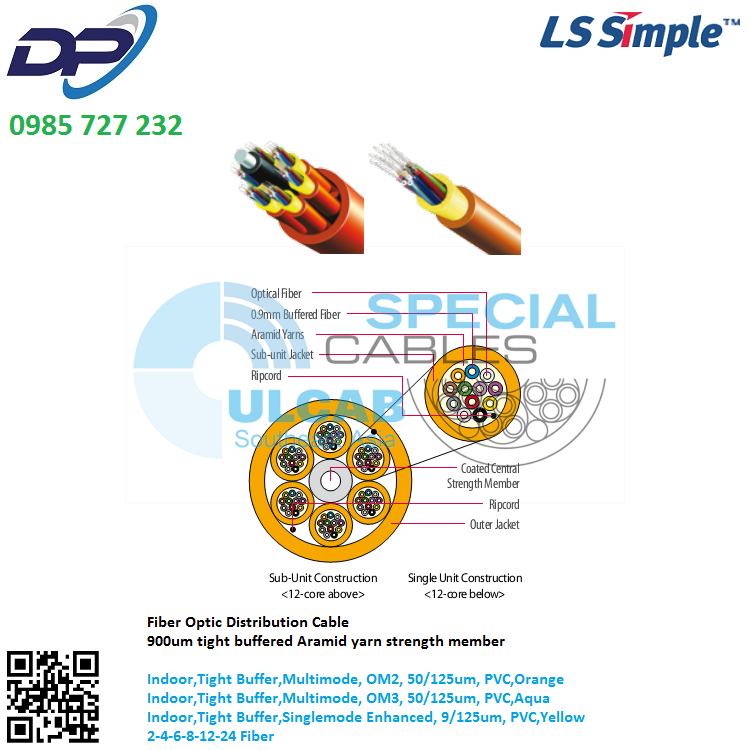 Cáp Quang LS-VINA ( DT-NVTKVXX/ARR SE24X(24N9.8YL) ) Indoor, Tight Buffer, Singlemode Enhanced, 9/125um, 24 Cores, PVC, Yellow