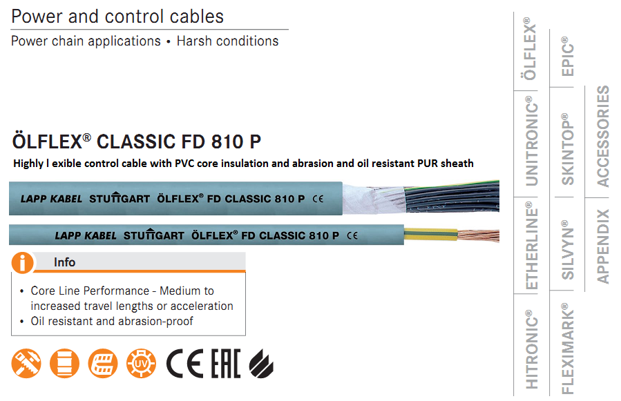 ÖLFLEX® CLASSIC FD 810 P – Power and control cable for versatile use in power chains in hash environmental conditions