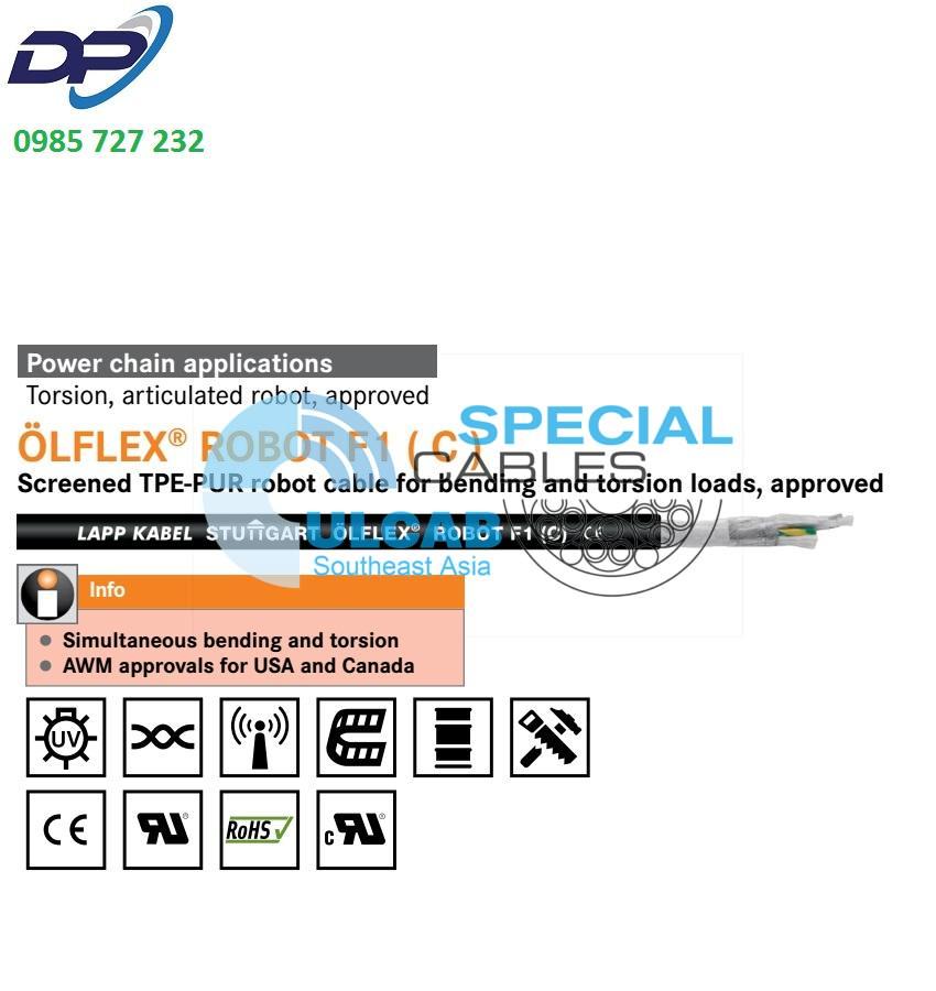 ÖLFLEX® ROBOT F1 (C) – shielded power and control cable for bending and torsional applications in harsh environmental conditions with UL/cUL AWM certification.