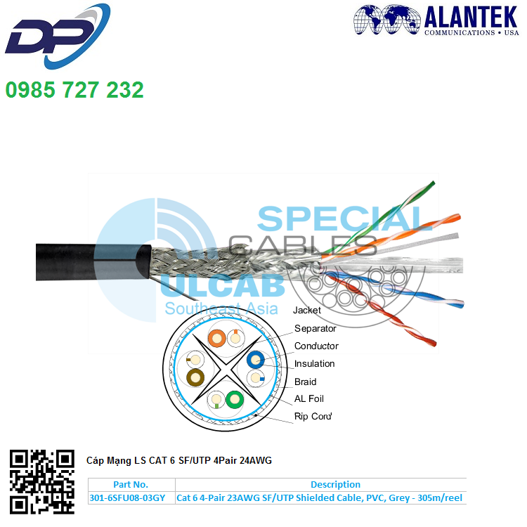 Cáp Mạng Alantek ( 301-6SFU08-03GY ) Cat 6 4-Pair 23AWG SF/UTP Shielded Cable, PVC, Grey – 305m/reel | Chính Hãng – Giá Tốt Nhất